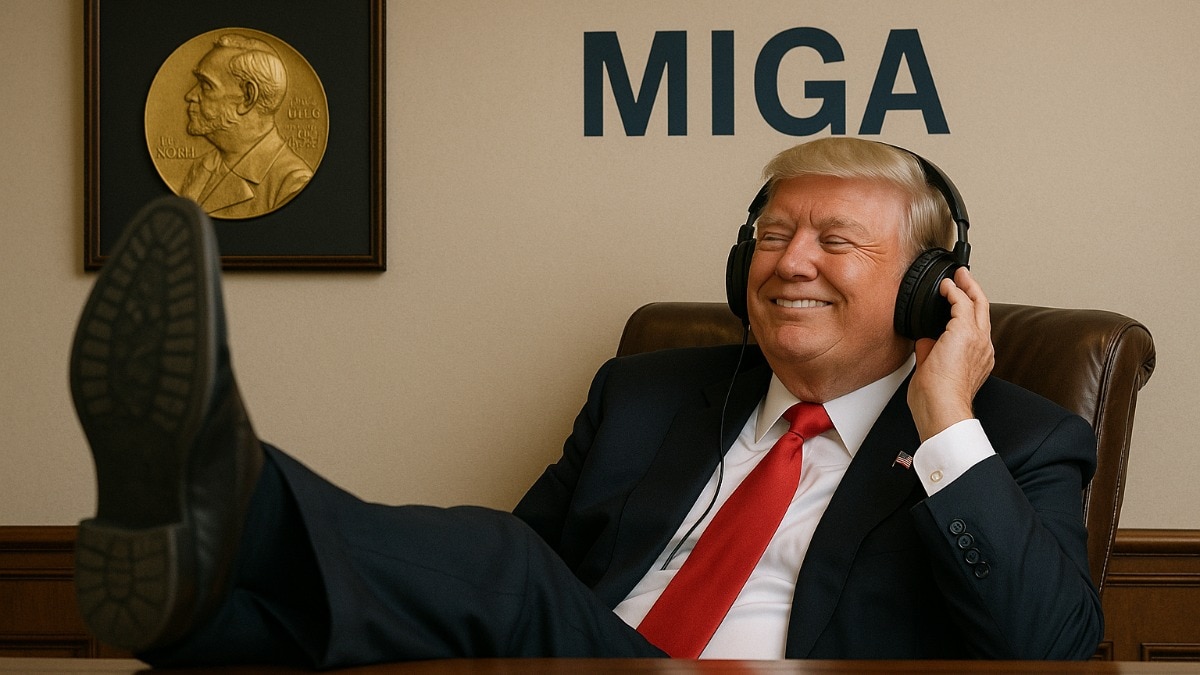 ममदानी जैसे डेमोक्रेट्स अब जेल में हैं और जेलेंस्की ने सूट पहनना शुरू कर दिया है. दुनिया में अब कहीं ‘युद्ध’ नहीं हो रहा, हालांकि लड़ाइयां अब भी चल रही हैं लेकिन उनका नाम अब ‘सीजफायर उल्लंघन’ रख दिया गया है. लोग अपने पारिवारिक झगड़े भी सुलझाने के लिए अब ओवल ऑफिस के बाहर लाइन लगाकर खड़े हैं. व्हाइट हाउस की दीवार पर टंगा है एक नोबेल और बैकग्राउंड में बज रहा है जावेद अख्तर का लिखा ट्रंप का पसंदीदा गीत-