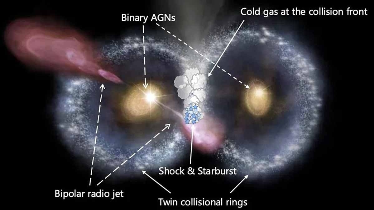 ‘कॉस्मिक उल्लू’ दो रिंग गैलेक्सी के टकराव से बना एक दुर्लभ ढांचा है, जो 11 अरब प्रकाश वर्ष दूर है. यह टकराव इतना खास है कि दोनों गैलेक्सी मिलकर उल्लू के चेहरे जैसी आकृति बनाती हैं, जिसमें दो चमकीली ‘आंखें’ और एक हल्की ‘चोंच’ दिखती है.