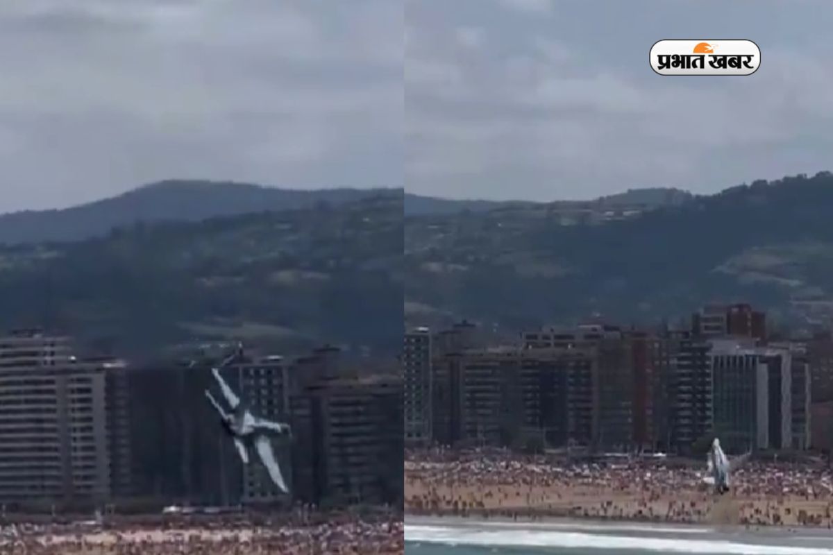 वीडियो देखें: स्पेन के गिजोन शहर में आयोजित एक एयर शो के दौरान रविवार को उस वक्त हड़कंप मच गया जब स्पेनिश एयर फोर्स का EF-18 हॉर्नेट फाइटर जेट बेहद कम ऊंचाई पर उड़ान भरते हुए अचानक असामान्य ढंग से झुक गया. यह नजारा उत्तरी स्पेन के सान लोरेंजो बे पर जमा हजारों दर्शकों ने देखा, जिनमें से कई लोगों ने घटना का वीडियो भी रिकॉर्ड किया.