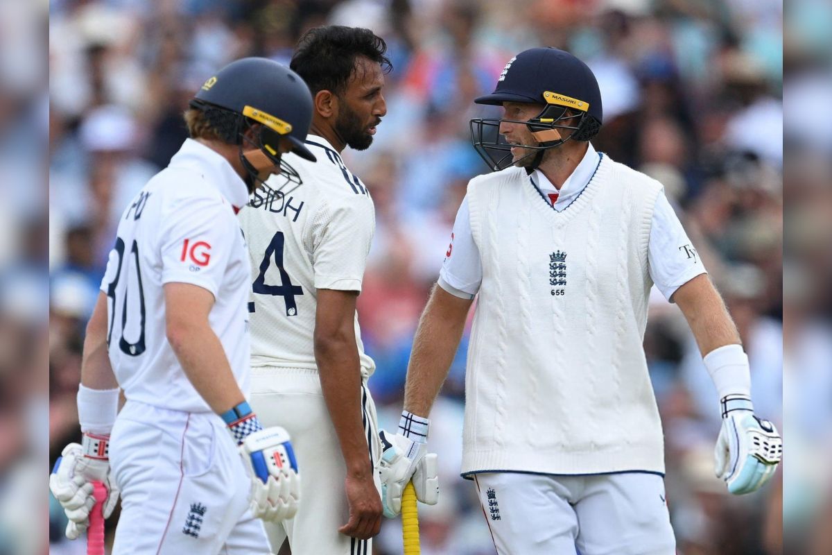 IND vs ENG Prasidh Krishna verbal spat with Joe Root: भारत और इंग्लैंड के बीच पांचवां और सीरीज का आखिरी टेस्ट मैच में भी विवादों की एंट्री हो गई है. मैच के दूसरे दिन भारत इंग्लैंड को किसी तरह जल्द से जल्द आउट करना चाहता था, लेकिन इंग्लिश बल्लेबाज अपनी कंडीशंस में अच्छा परफॉर्म कर रहे थे. इसी दौरान दूसरे दिन के अंत में भारत के तेज गेंदबाज प्रसिद्ध कृष्णा ने इंग्लैंड के जो रूट के साथ हुई ऑन-फील्ड बहस हो गई. इस पर अंपायर को भी मामले को शांत कराते हुए देखा गया. हालांकि यह बहस क्यों हुई, इस पर कृष्णा ने दिन का खेल समाप्त होने के बाद बात की. उन्होंने इसको हल्के अंदाज में लेते हुए कहा कि यह सिर्फ अच्छा मजाक था.