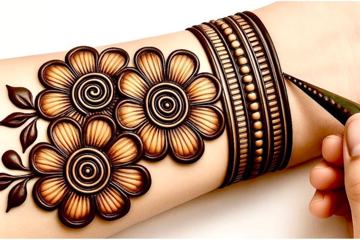 कलाई पर ब्रेसलेट डिजाइन :यह एक मॉडर्न और स्टाइलिश डिजाइन है.अपनी कलाई के चारों ओर एक सुंदर ब्रेसलेट जैसा पैटर्न बनाएं. आप इसमें छोटे फूल, पत्तियां या कोई भी गोल या चौकोर आकार बना सकती हैं.