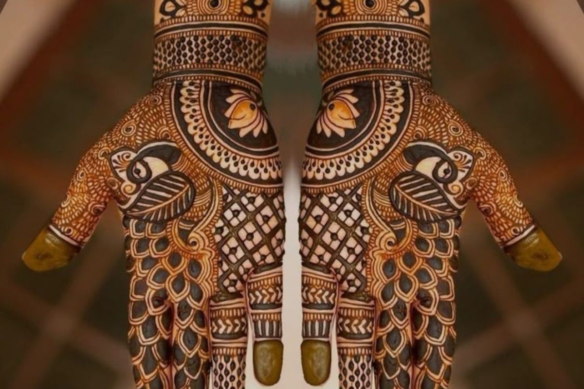 फुल हैंड ट्रेडिशनल मेहंदी : हथेली से लेकर कलाई तक भरपूर पैटर्न. दूल्हा-दुल्हन, मोर, और मंदिर डिजाइन के साथ खास तीज लुक.