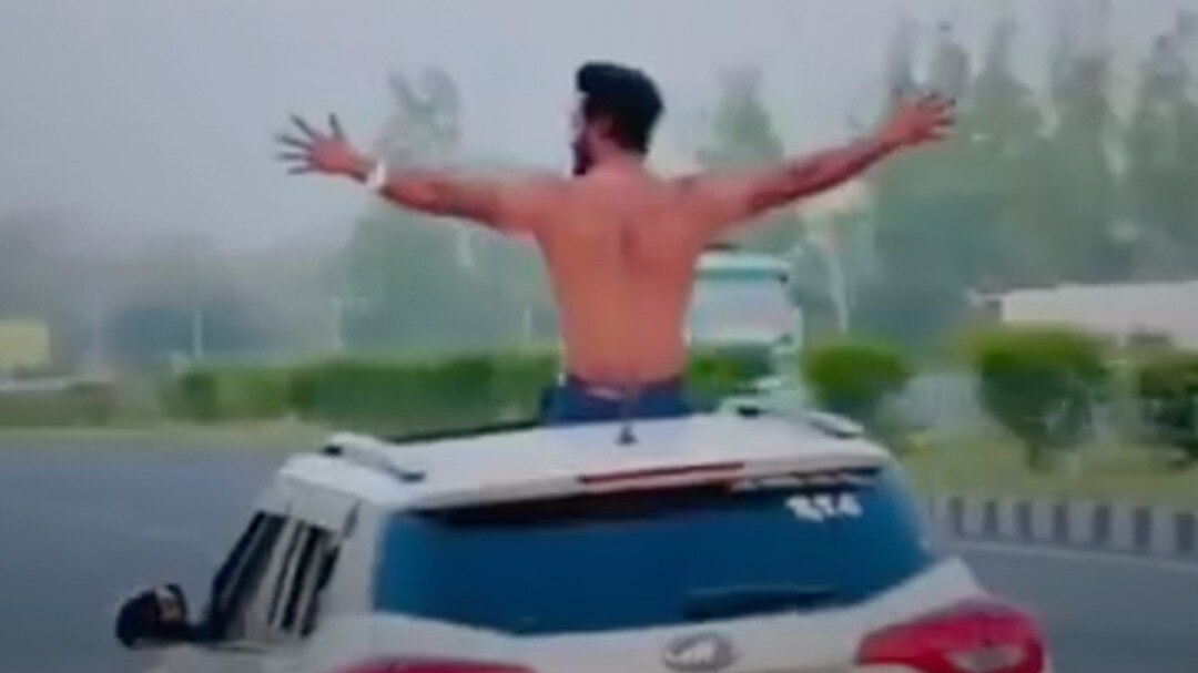 यूपी की हापुड़ पुलिस ने स्टंटबाज के खिलाफ एक्शन लिया हाइवे पर चलती कार की सनरूफ से बाहर निकलकर अर्धनग्न हालत में स्टंट करने वाले युवक के खिलाफ इक्कीस हजार पांच सौ रुपये का चालान काटा है. गढ़मुक्तेश्वर कोतवाली क्षेत्र में युवक ने तेज रफ्तार कार में गाने बजाकर हंगामा किया. जिसका वीडियो पीछे चल रहे राहगीर ने बनाकर सोशल मीडिया पर वायरल कर दिया. यातायात पुलिस ने वीडियो का संज्ञान लेकर तत्काल एमवी एक्ट के अंतर्गत गाड़ी का चालान किया.