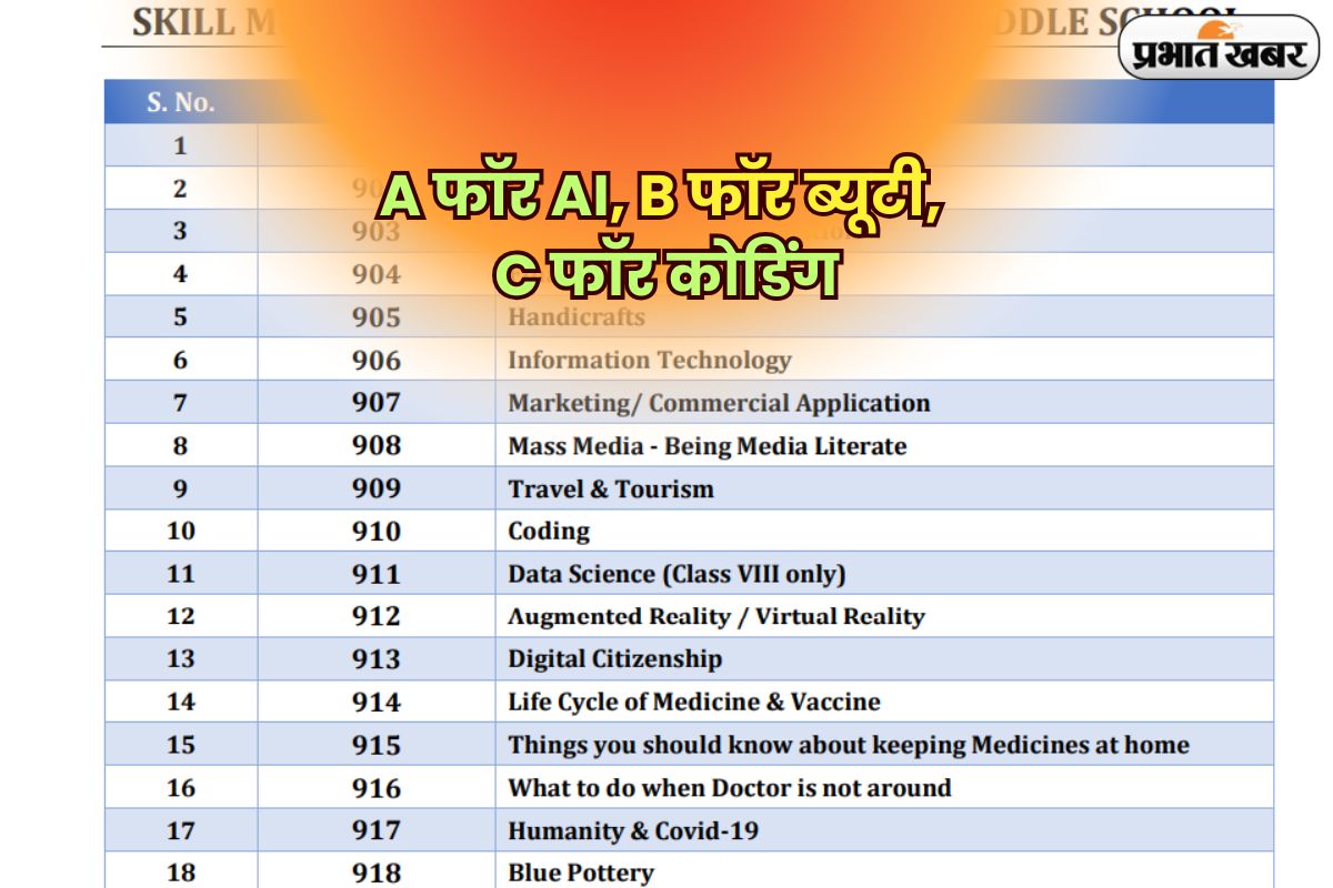 CBSE के नए नियम के मुताबिक अब कक्षा 6 से 8 तक के सभी छात्रों को कम से कम एक स्किल सब्जेक्ट पढ़ना अनिवार्य होगा. ये विषय बच्चे अपनी रुचि के अनुसार चुन सकते हैं. इसका मकसद बच्चों को नई तकनीक, रोजमर्रा की जिंदगी के काम, और भविष्य के करियर के लिए तैयार करना है.